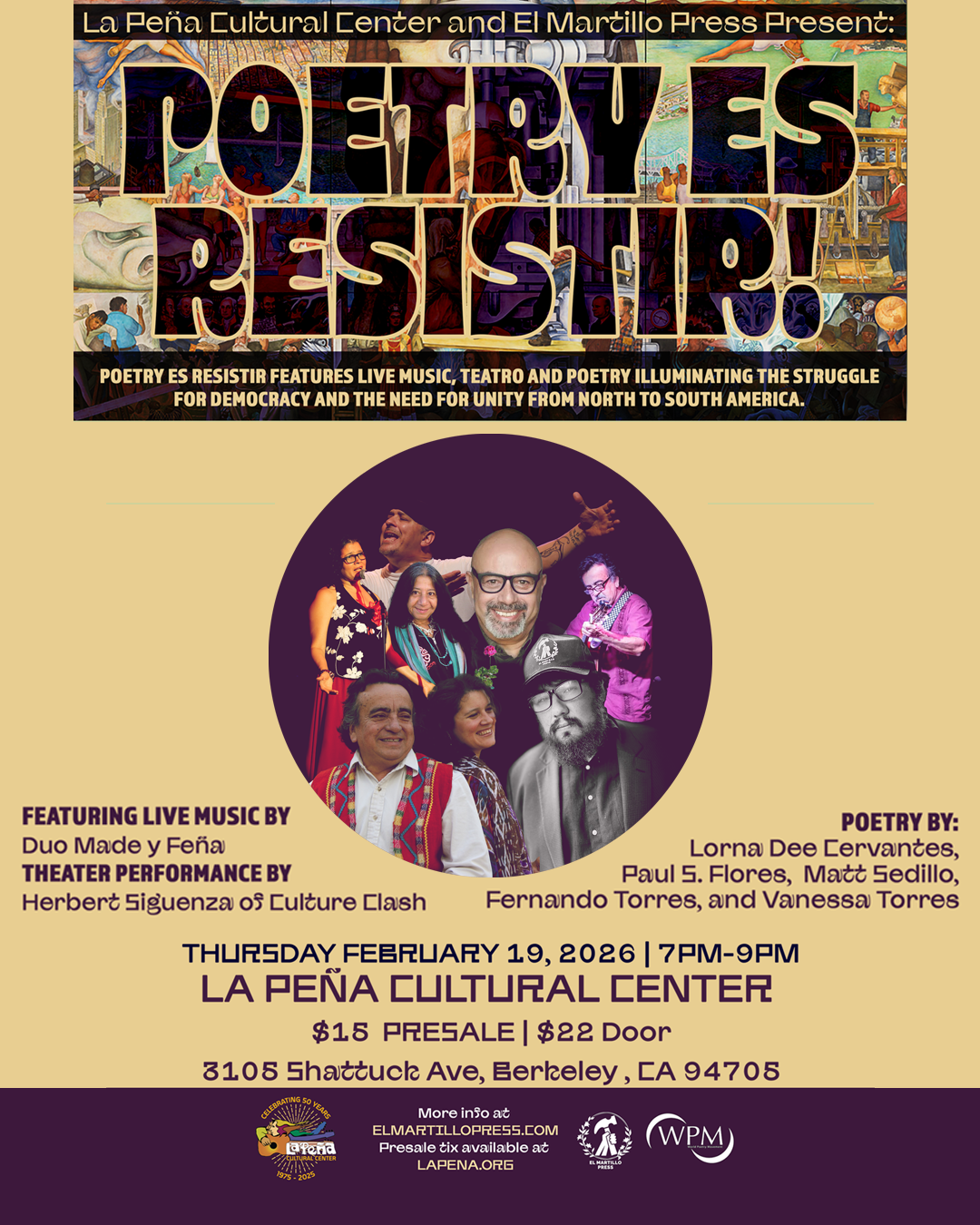 POETRY ES RESISTIR February 19, 2026 at La Peña Cultural Center, Berkeley, CA! Get Advance Tickets here