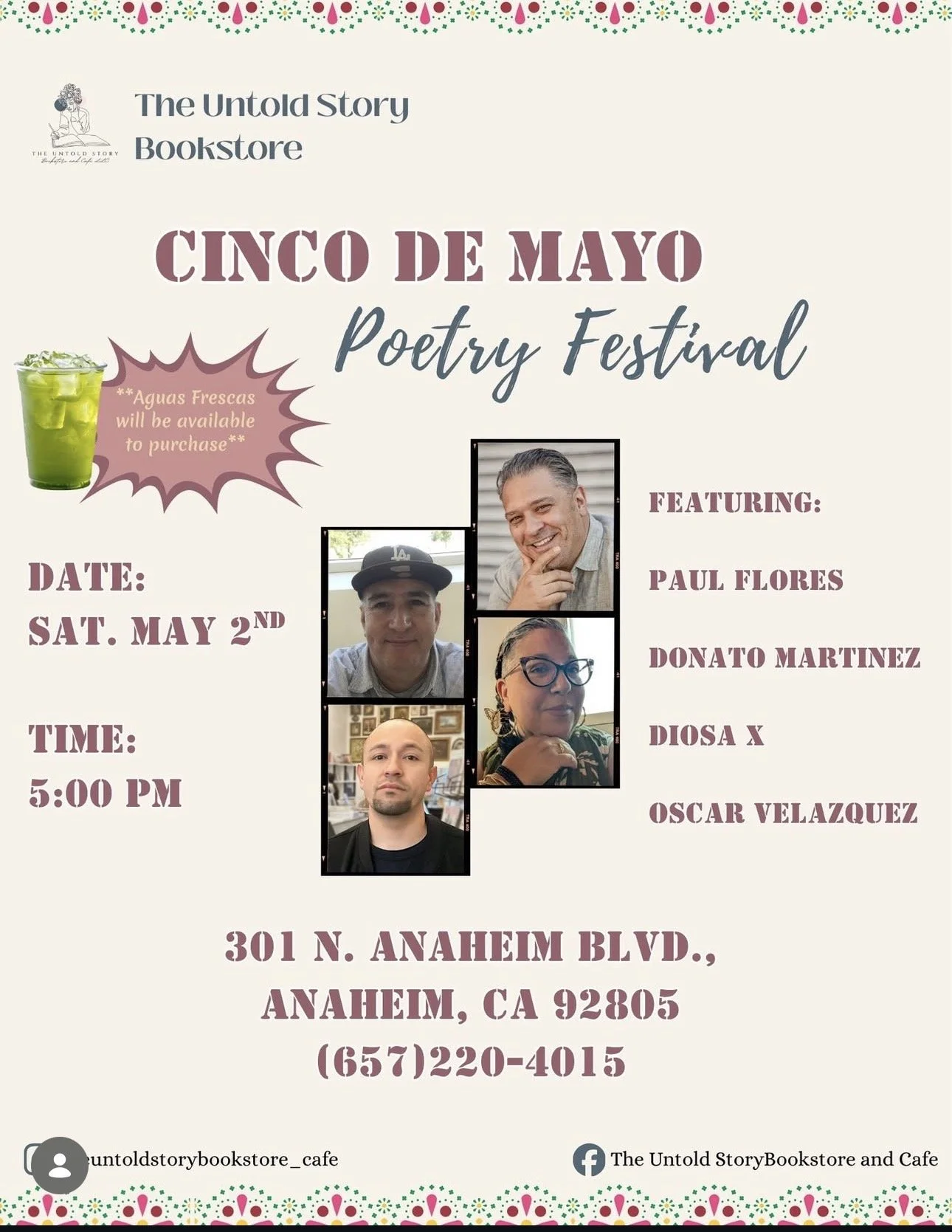 Join Poets Paul S. Flores, Donato Martinez, Oscar Velazquez, Diosa X, and Darren De Leon on May 2 (Saturday) for a poetry reading celebrating Cinco de Mayo with pan dulce and horchata at Anaheim’s favorite bookstore and cafe The Untold Story. 5PM-7PM